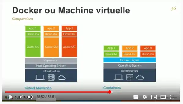 La notion de conteneurisation est un terme technique qui ne se limite pas à Docker. Cette approche est possible avec plusieurs technologies et vient du monde de Linux. C’est une solution alternative à la machine virtuelle. Celle-ci est souvent coûteuse à mettre en place, à maintenir et à déployer à grande échelle car elle embarque le système d’exploitation avec elle. En simplifiant, l’approche par conteneur permet plus de légèreté car le conteneur se base sur le système d’exploitation de la machine sur lequel il est embarqué, permettant un démarrage et une utilisation du disque réduite. Docker amène également une approche par couches (ou “layer”) qui permet le partage des définitions communes à plusieurs conteneurs, entre autres.