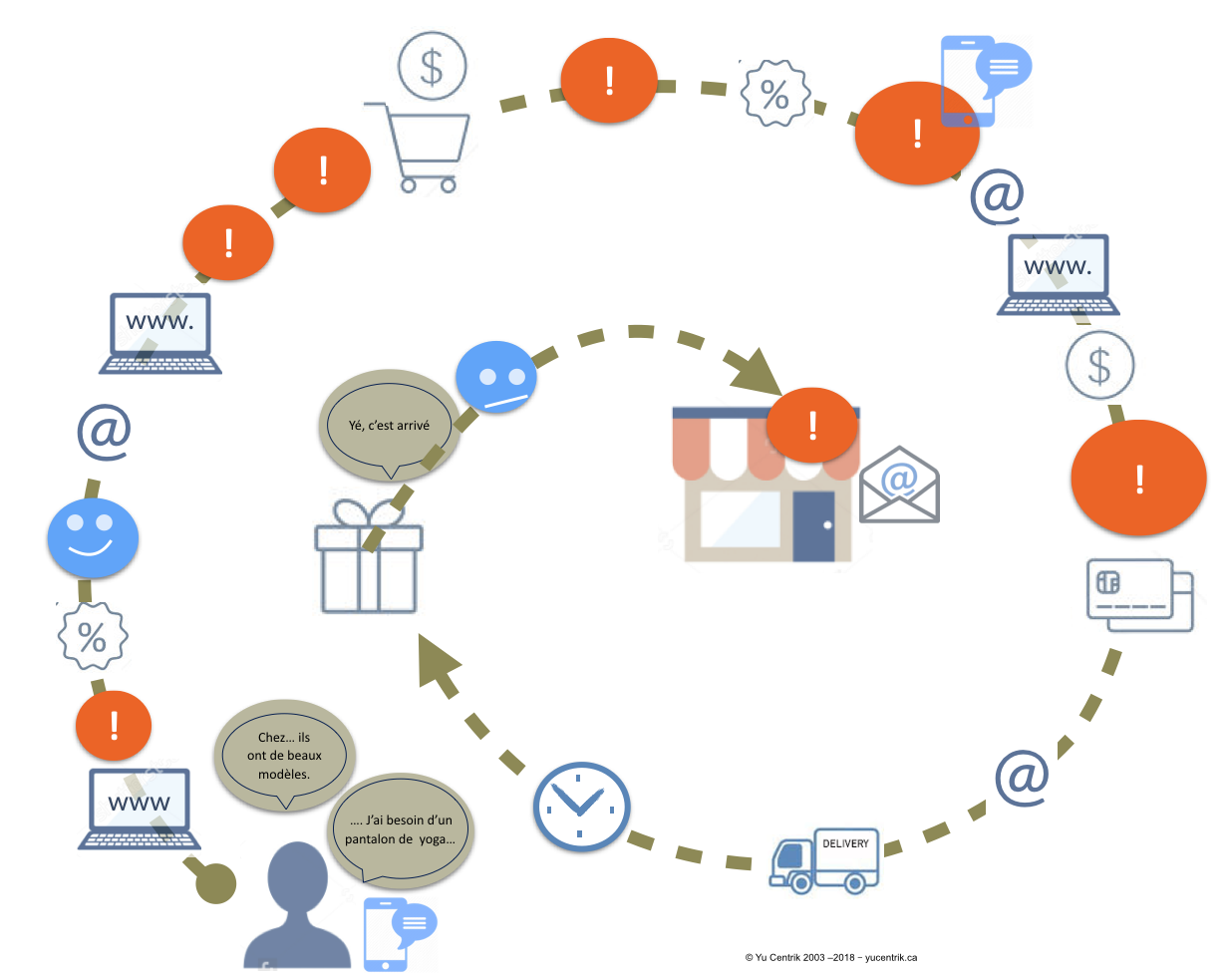 Cette carte est celle d’un achat en ligne qui débute sur le site Web mobile d’une marque canadienne connue qui vend ses produits en ligne et aussi en magasin. Le but ici est de démontrer que le site présente des opportunités d’amélioration qui permettraient de réduire le taux d’abandon du panier d’achat ou de rebond et d’augmenter le taux de conversion.