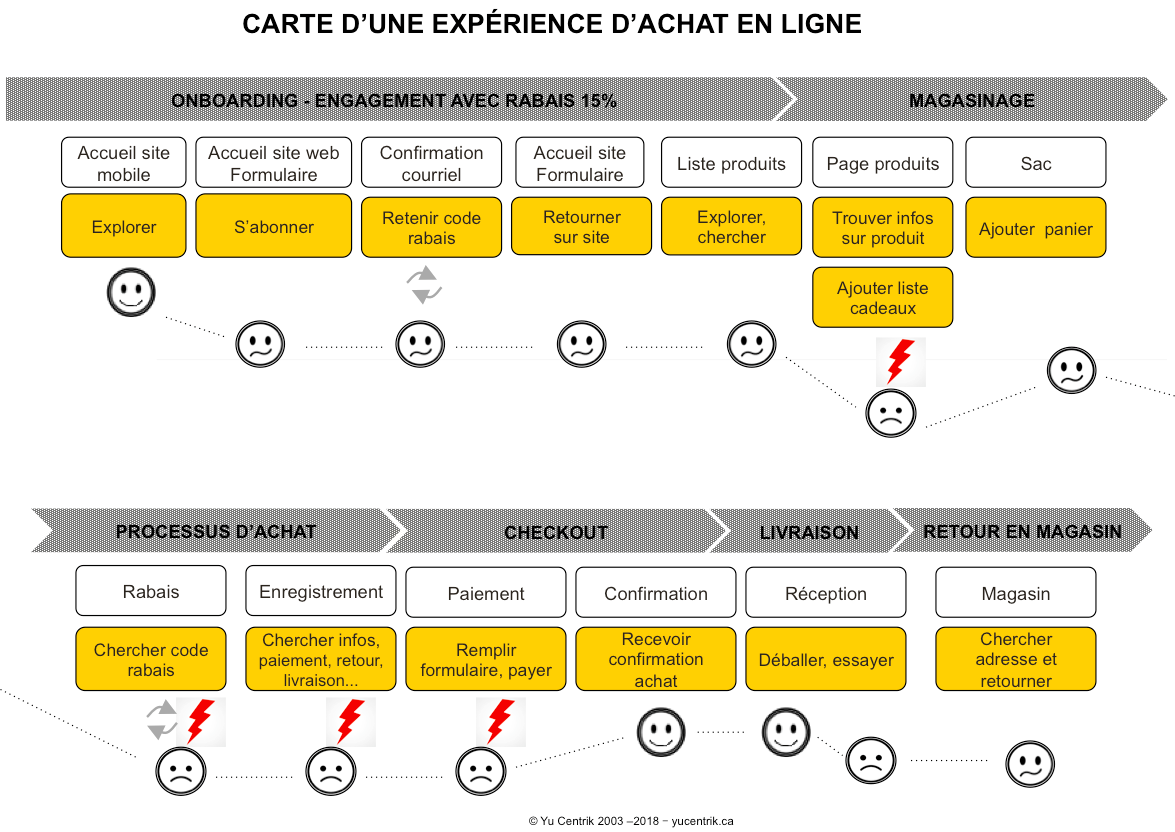 Cette carte illustre une histoire telle qu'elle est vécue par le client ou l’usager. Il y a différentes façons de représenter l'expérience client, de multiples exemples sont disponibles sur le Web, toutes les formes sont intéressantes, des plus simples aux plus sophistiquées. L’histoire racontée identifie et illustre entre-autres les multiples points de contact client, les bonnes et les mauvaises expériences vécues avec l’organisation et les émotions qui en découlent.