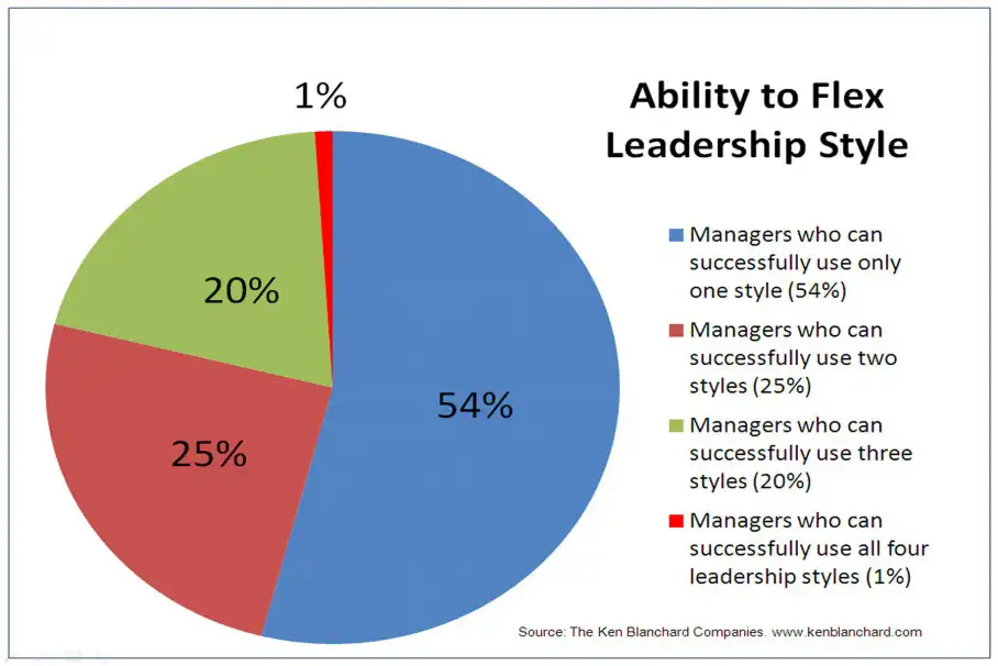 Selon une étude récentei, 54% des gestionnaires dirigent en utilisant un seul style de leadership. En d’autres mots, qu’ils cherchent à influencer une ressource sénior ou une ressource junior, qu’ils soient dans un contexte de réorganisation ou de croissance, la majorité des gestionnaires utilisent uniquement leur style de leadership naturel pour influencer, motiver et diriger!