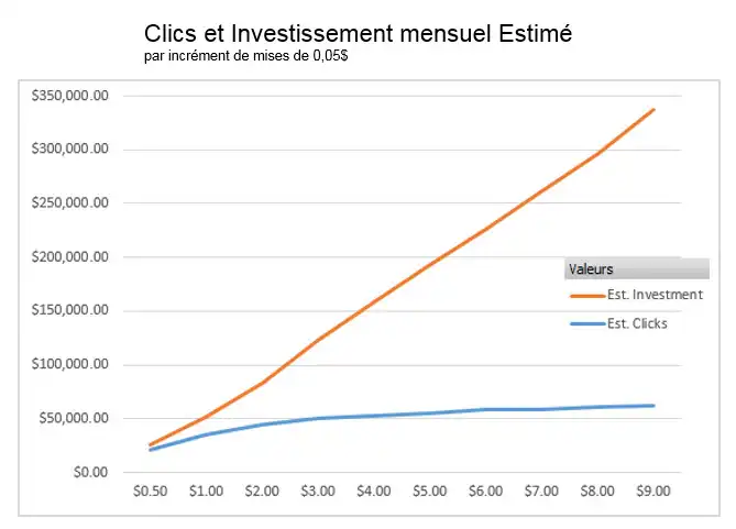 Ce chiffre vous indique la taille du marché (recherches totales effectuées) selon qu’il est en train de réduire ou de croître. Il vous indique aussi le potentiel de croissance de vos tactiques. Finalement, ce chiffre vous indique à quel point vos résultats ont une part de hasard. Si vous occupez 5 % des parts de marchés, cela signifie que, chaque jour, vous affichez vos publicités sur une infime parcelle de l’espace disponible. Imaginez 30 personnes qui se jettent sur un buffet et vous, qui, chaque jour, vous composez une assiette avec les restes. Est-ce que la qualité de votre assiette sera constante? Il faut aussi faire attention à la croissance, gardez ce modèle de décroissance linéaire de vos investissements AdWords en tête.